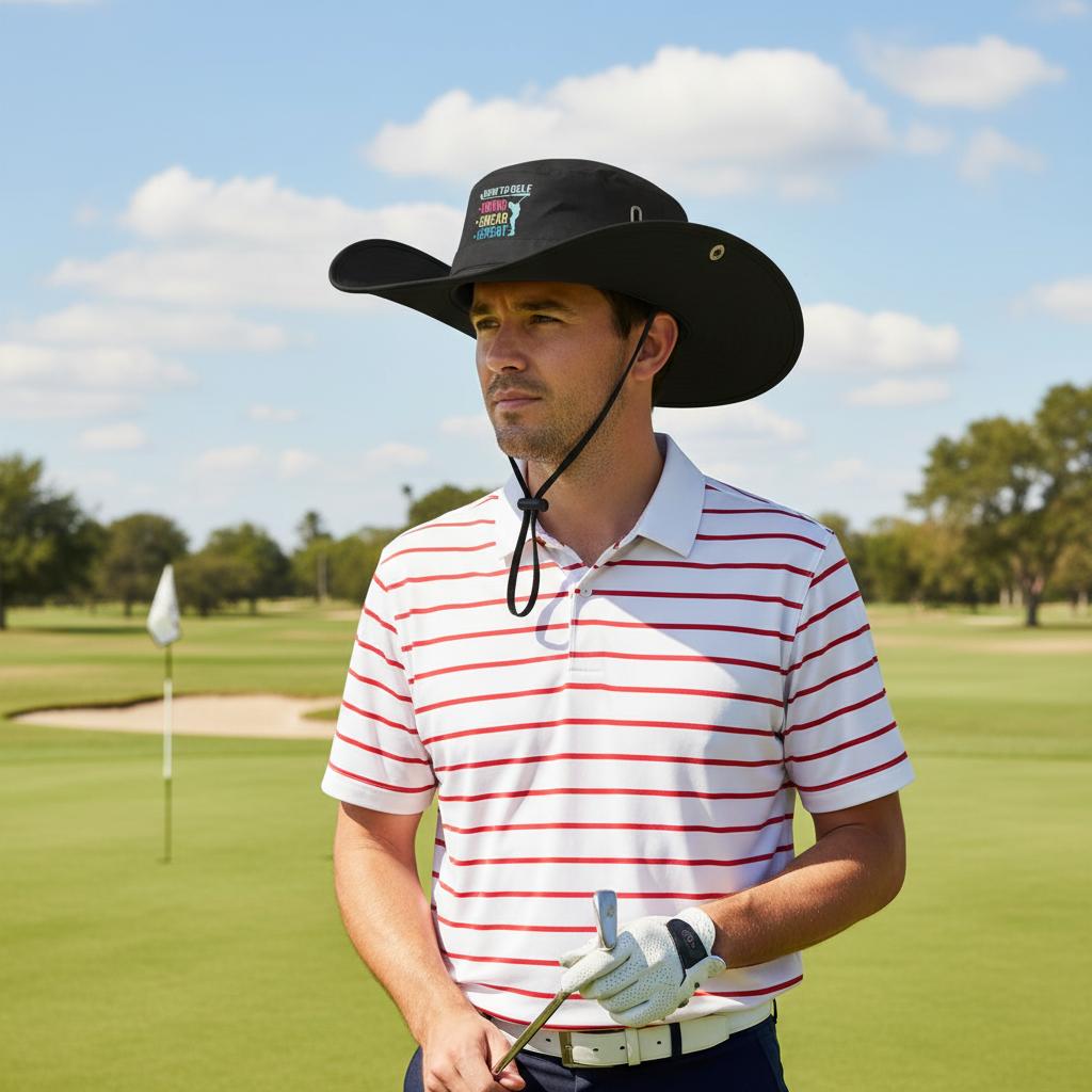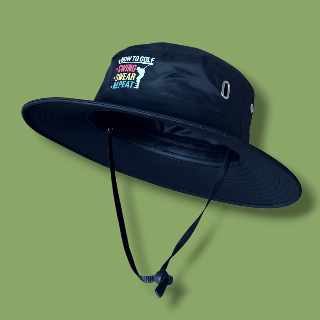 Dizajn dopĺňajú decentné golfové texty, ktoré jasne ukazujú, že patríte na green. Praktickým detailom je aj šnúrka pod krkom – ideálna do veterného počasia, aby klobúk zostal na svojom mieste, alebo keď si ho chcete pohodlne zavesiť na chrbát.