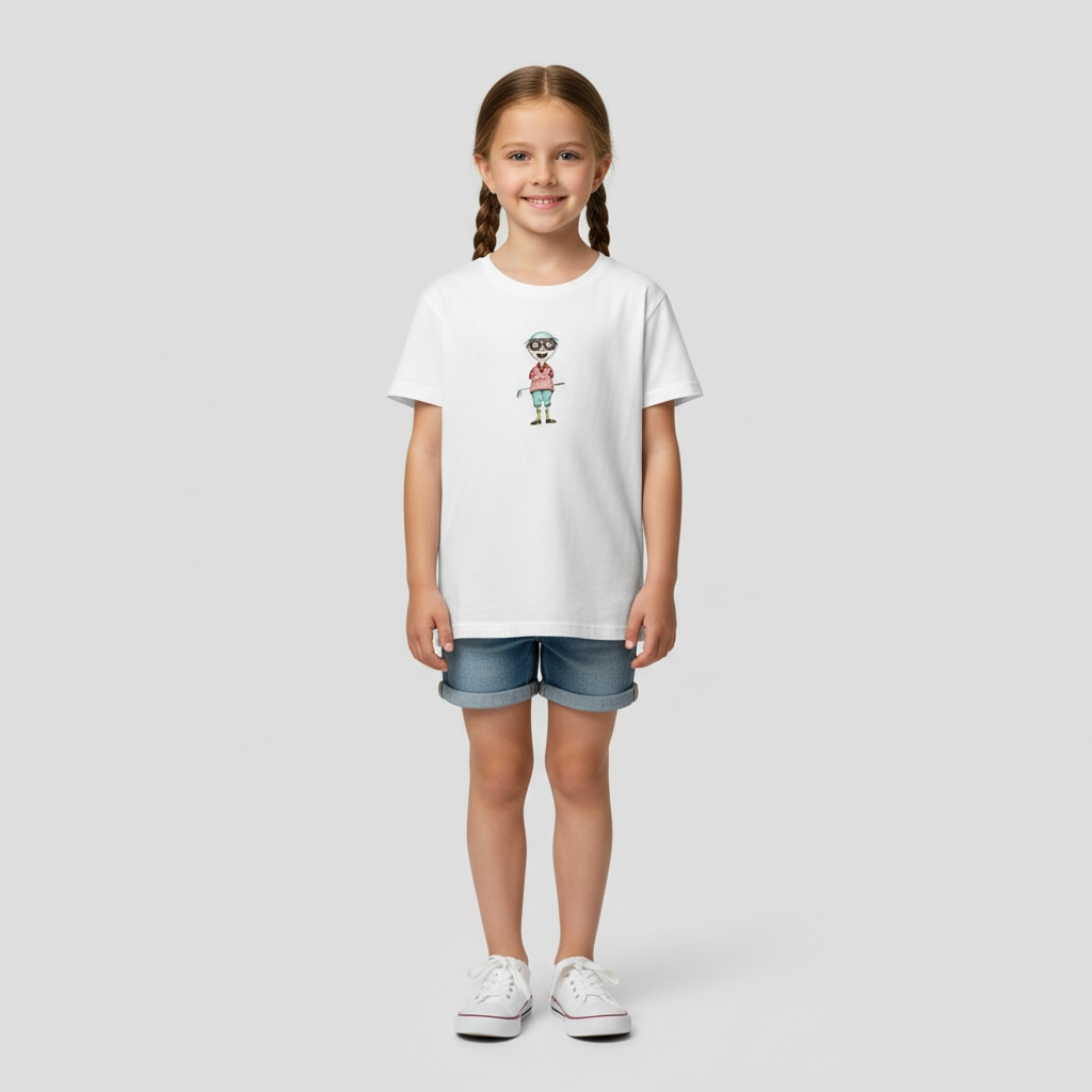 Jednoduché biele bavlnené tričko pre dievča s obrázkom Vincenta. Vincent je golfista. Buď ako Vincent! Pandrláka, golfistu Vincenta pre nás navrhla výtvarníčka Alžbeta Čáková.